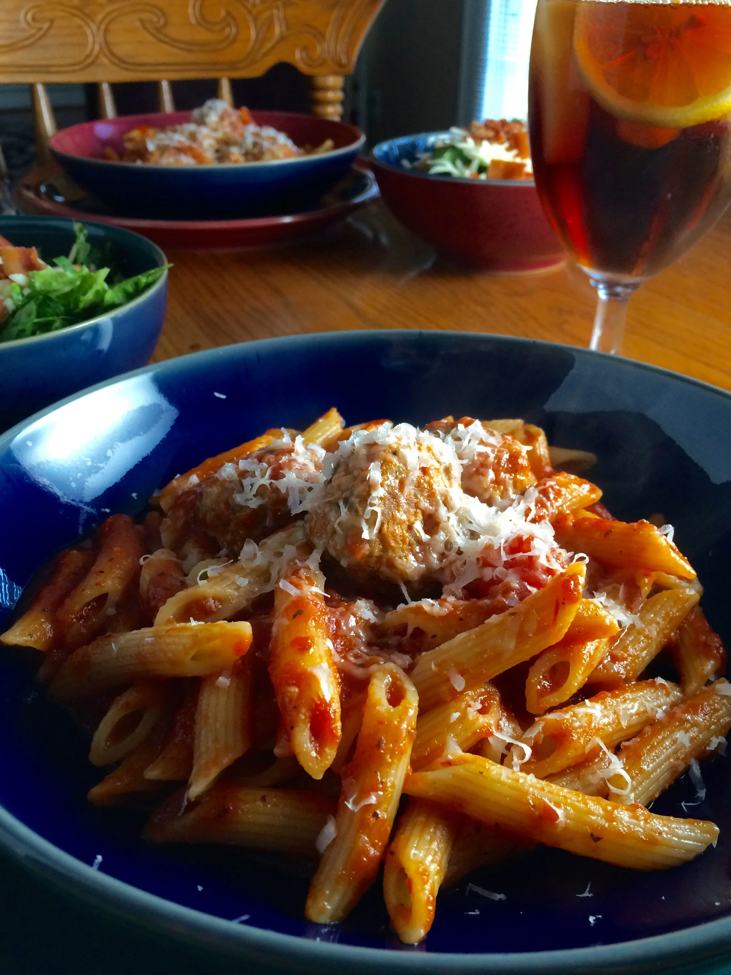 Add the meatballs to your favorite marinara sauce and simmer for at least 20 minutes. Add pasta to the mixture serve immediately with lots of parmesan cheese.